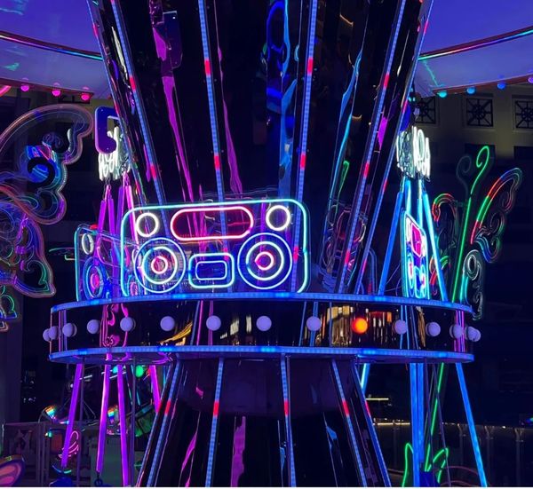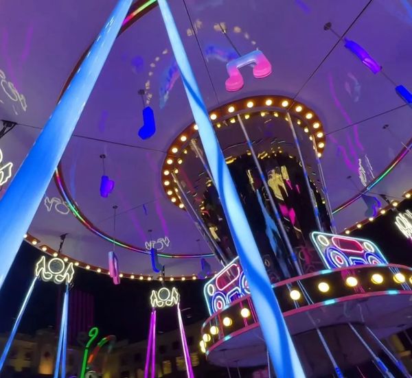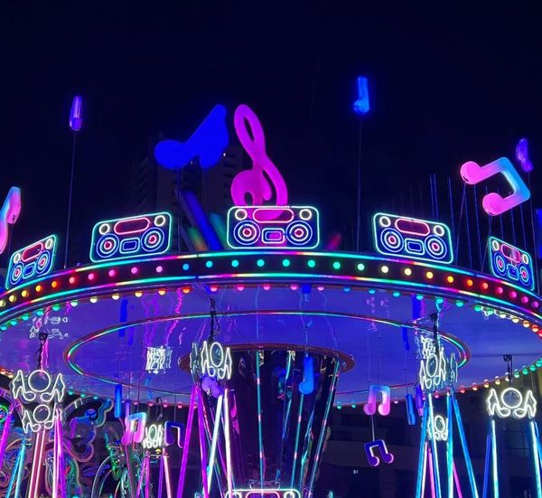 ③ 绚丽的灯光与惊艳的视觉效果 飞椅装配有彩色炫目的灯光,当夜幕降临时,灯光效果尤为抢眼,为游客带来视觉上的冲击和美感。