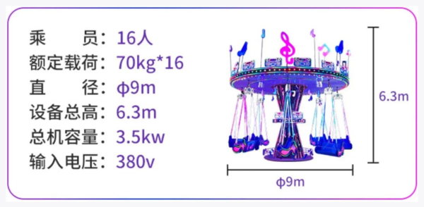产品特点 Product features ① 浪漫音乐主题设计 音乐飞椅设计以浪漫的音乐主题为核心,每一次旋转都伴随着悦耳的音乐,为游客提供了一个充满节奏感和浪漫氛围的体验。
